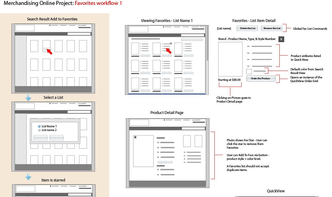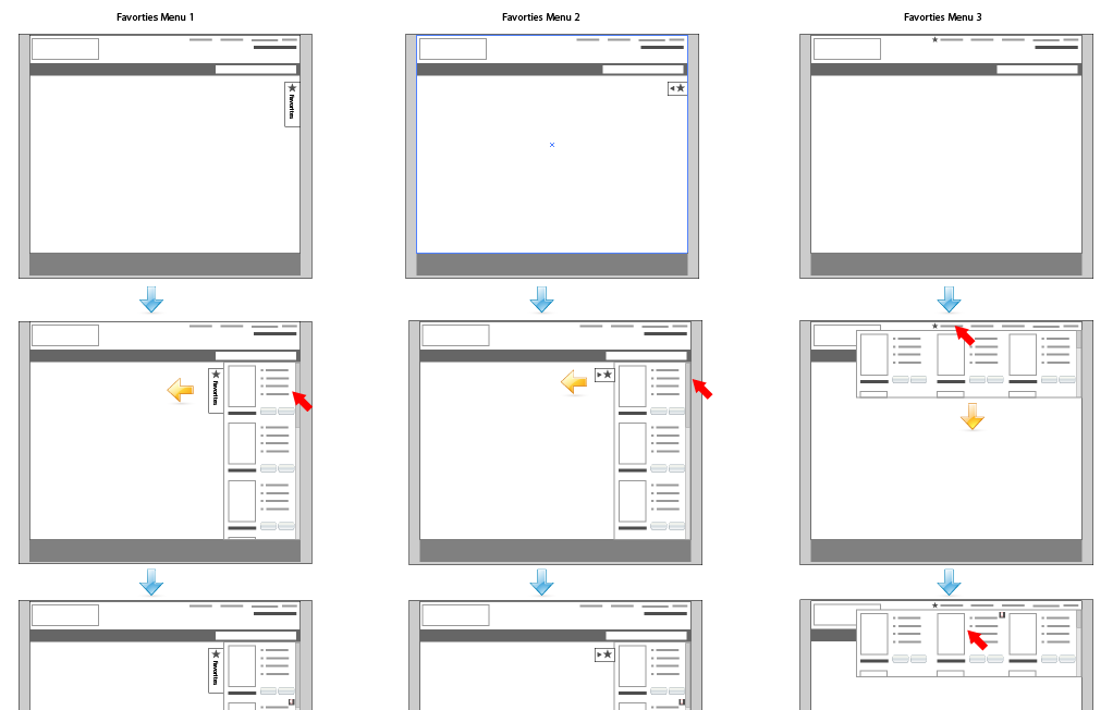 I came forth with a hypothesis; that a Favorites pattern would fit their workflow better. The first action I took was to map out what the page flow would look like for a Favorites feature.