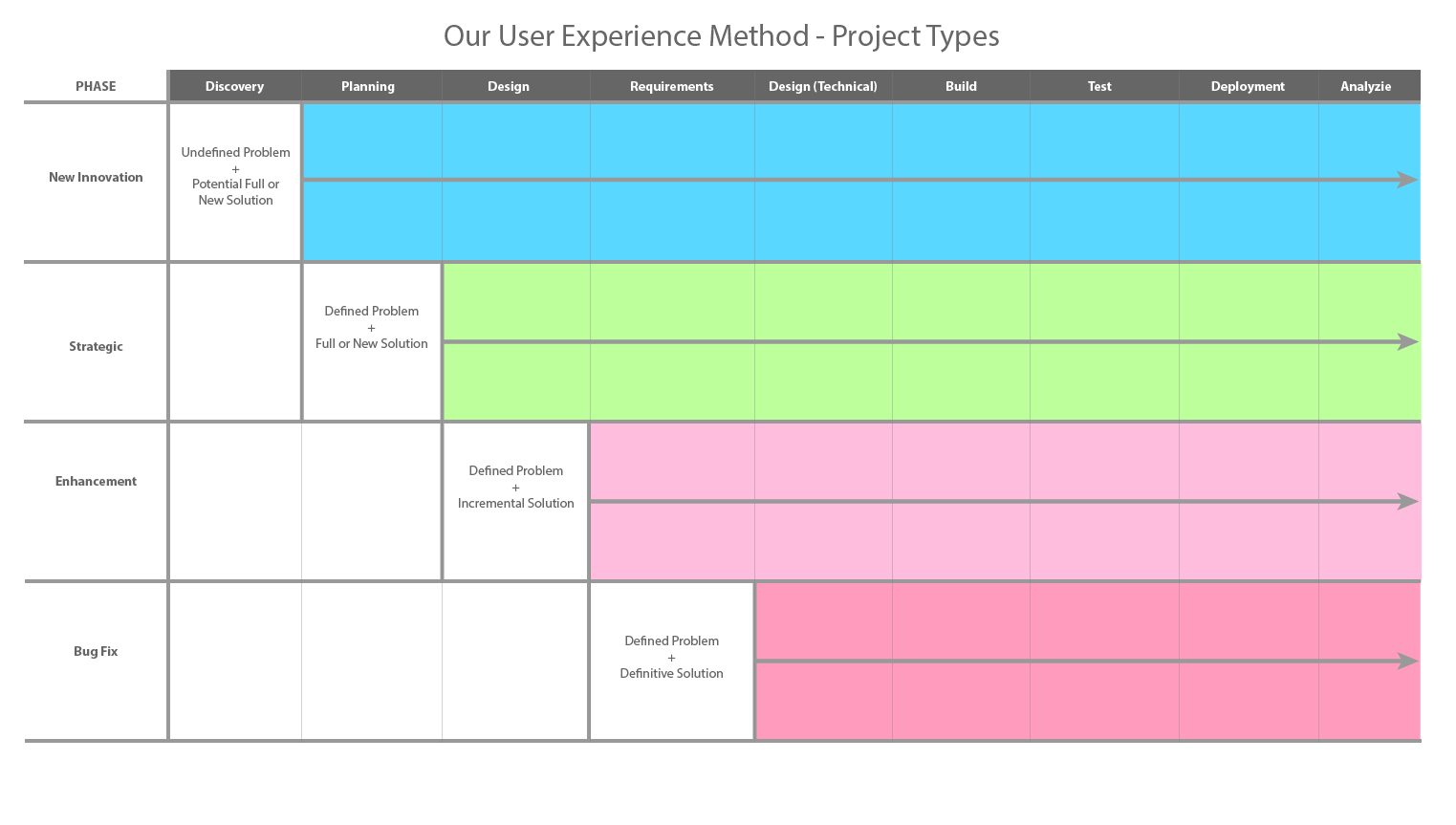 At the same time the organization was defining project types; so, we worked the project types in as an overlay on our End to End UX Method diagram, mapping them to the appropriate PLC phases. Coupled with the light definition of each project type, this diagram help us all get on the same page with where each type should start and flow.