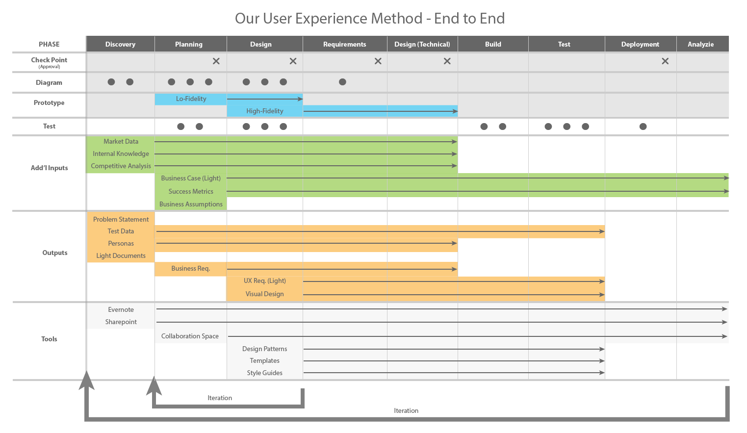 We took the results of those meetings to the drawing board and began work on a framework that mapped to the flow of our current project life cycle. Our first attempt at diagraming our framework included too much detail, such as testing tools, build processes, etc. We found that it was too tedious to maintain all of that information in a single diagram and decided to keep the details focused to the information that was critical to collaborative understanding as related to project user needs, business goals, design definitions and keep the processes outside of core user experience with their respective owners.